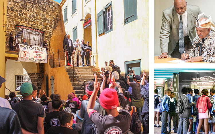 The protest march in Cape Town against the World Psychiatric Association (WPA) International Congress, culminated in the opening of the Citizens Commission on Human Rights world-acclaimed free traveling exhibit, Psychiatry: An Industry of Death, at the Castle of Good Hope. The “mobile museum” includes historical sections on psychiatry’s role in apartheid as well as contemporary sections on psychotropic drugs and children’s rights.